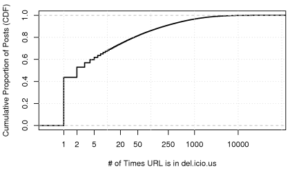 The figure below (click for larger version) shows the distribution of the number of times a URL just posted is previously in del.icio.us: