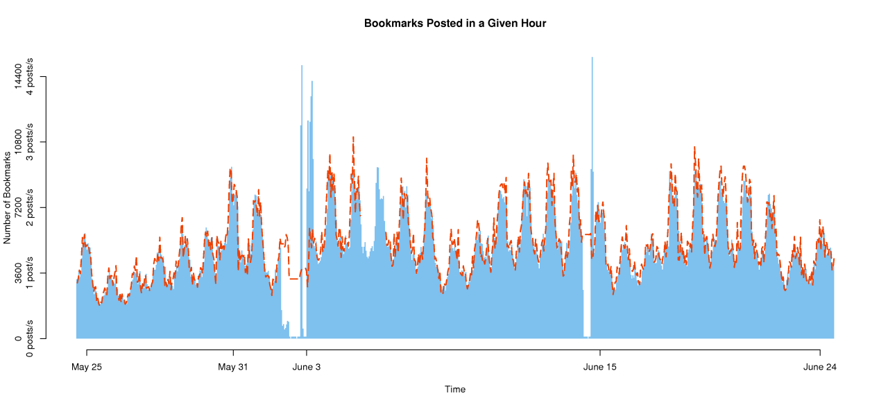 The posts per day go up during mid-day and go down at night. They also drop on weekends. The two large spikes are outages when del.icio.us went down.