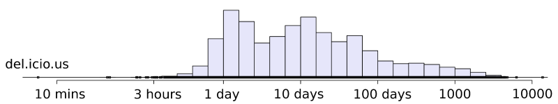 For example, if a page (say, Slashdot) was just posted by a user (say, "Bob") and when it was posted, that page was changed one day ago, it would slightly increase the height of the bar above one day. Time is in log-scale.