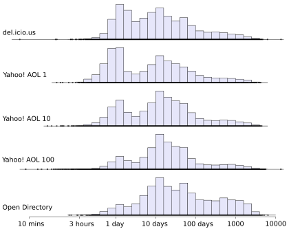 For ODP, we randomly sampled URLs from the data dump. We then searched for those URLs with the Yahoo! Search API, and recorded the ModificationDate attribute (see here and here for ModificationDate attribute information). Because HTTP/1.1's Last-Modified header turns out to be infrequently used and often incorrect, it's more sensible to use a search engine's information on recency. We determine the recency for del.icio.us URLs in the same way.
