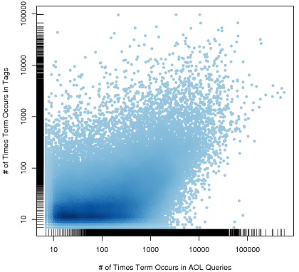 The scatter plot below shows the popularity of a query term in the AOL query log dataset versus the popularity in del.icio.us (click for larger version):