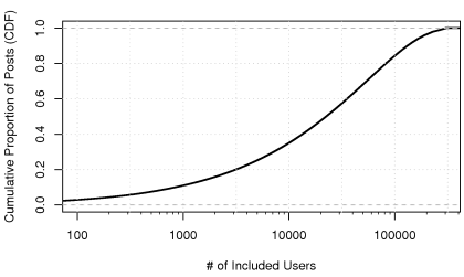 For a one month period, we looked at the proportion of posts contributed by the top n users (click for larger version):